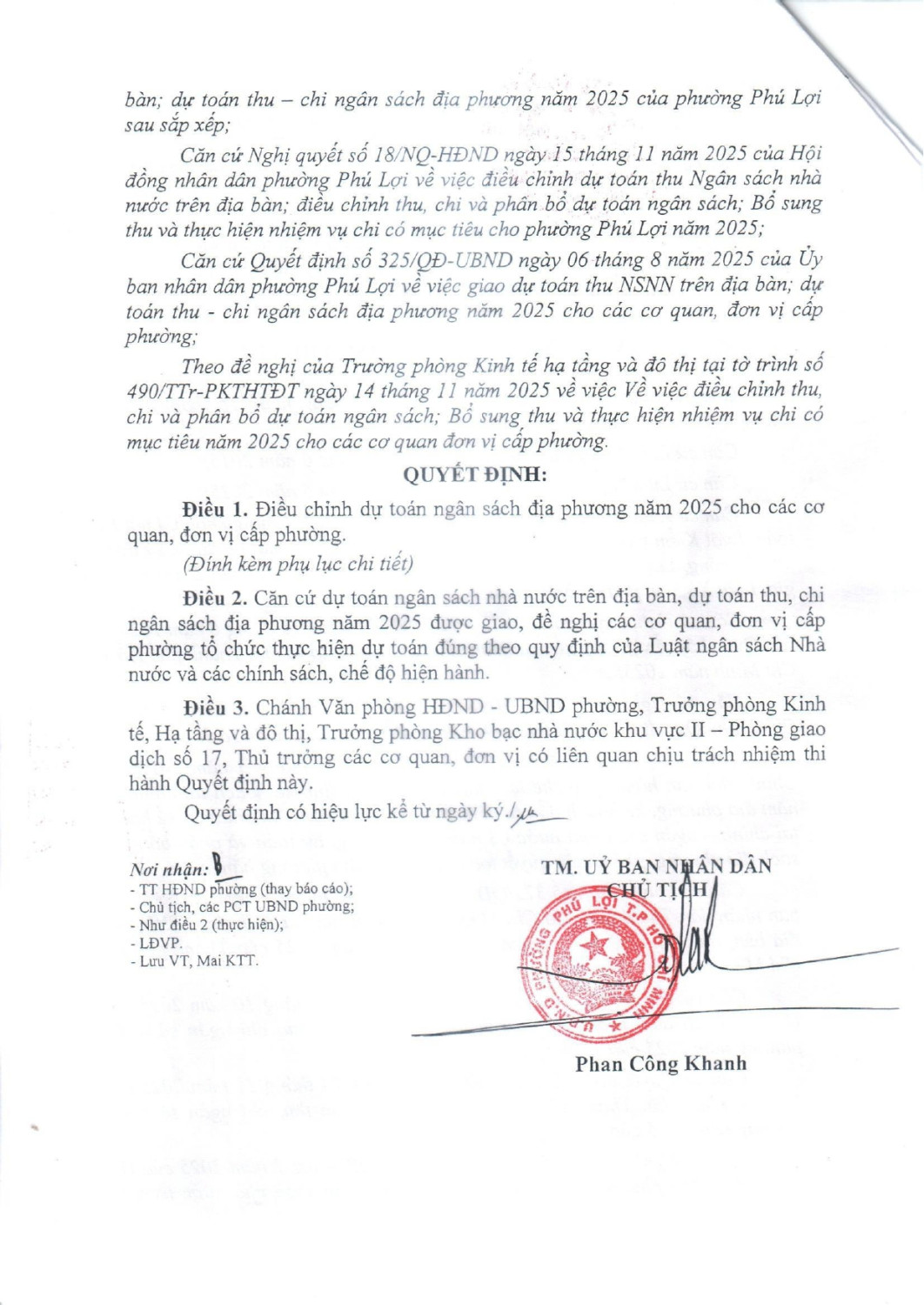 Quyết định về việc điều chỉnh thu,chi và phân bổ dự toán ngân sách.Bổ sung thu và thực hiện nhiệm vụ chi có mục tiêu năm 2025 cho các cơ quan đơn vị cấp phường