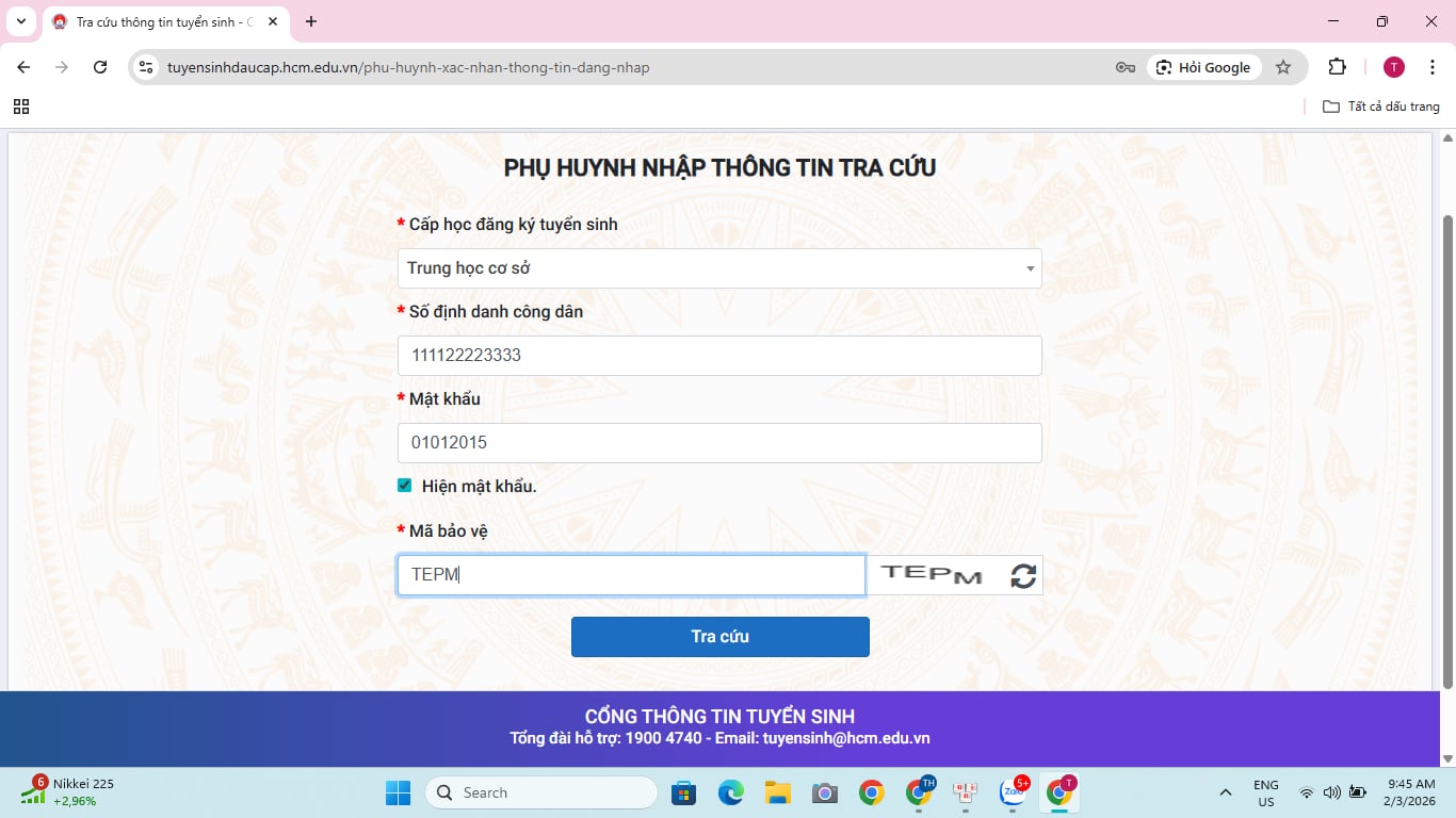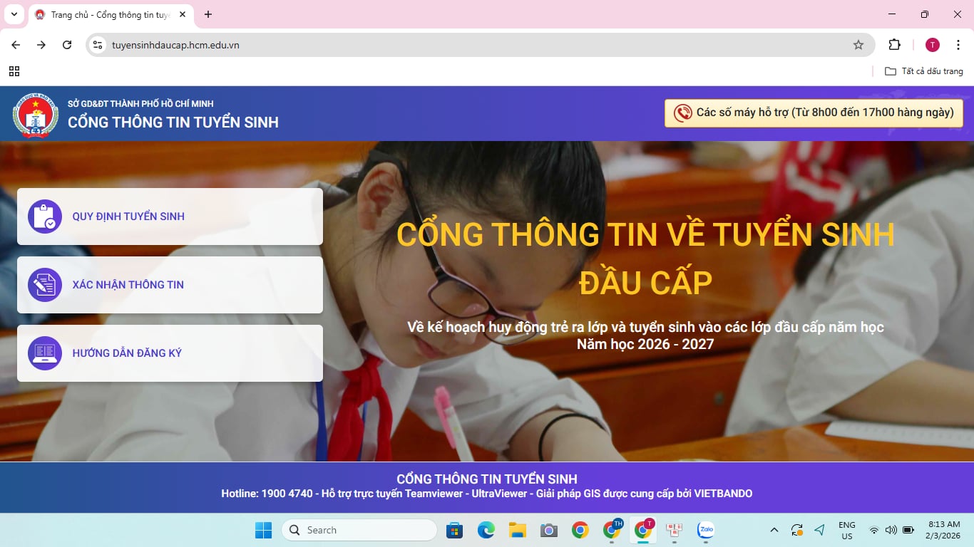 Từ ngày 3/2 đến 3/3/2026, phụ huynh tiến hành rà soát, xác nhận thông tin trên trang tuyển sinh đầu cấp https://tuyensinhdaucap.hcm.edu.vn