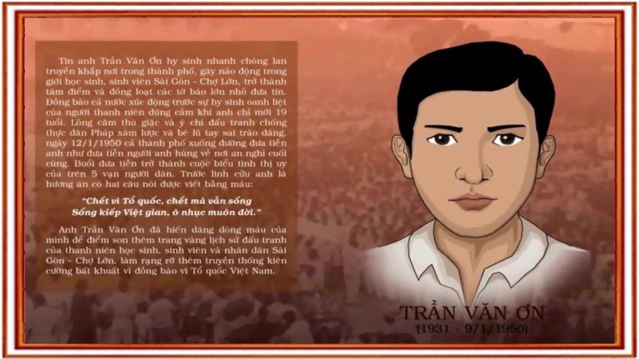 Sau ngày Toàn quốc kháng chiến 19-12-1946, hưởng ứng lời kêu gọi của Chủ tịch Hồ Chí Minh, các tầng lớp nhân dân cả nước đứng lên chống thực dân Pháp xâm lược, bảo vệ nền Cộng hòa non trẻ. Trong những năm 1949-1950, phong trào đấu tranh của thanh niên, học sinh, sinh viên các đô thị diễn ra liên tục, rầm rộ và rộng khắp, nhất là ở Sài Gòn - Gia Định. Ngày 9-1-1950, Đoàn thanh niên Cứu Quốc và Đoàn học sinh, sinh viên Sài Gòn-Gia Định-Chợ Lớn đã tổ chức vận động trên 10.000 nhân dân, trong đó đông đảo nhất là học sinh sinh viên, xuống đường biểu tình tình đòi đảm bảo an ninh cho học sinh Sinh viên học tập và trả tự do cho những học sinh sinh viên bị bắt trong đó có ban lãnh đạo học sinh cứu quốc Sài Gòn. Bị chính quyền thực dân đàn áp dã man, dưới trận mưa dùi cui, ma trắc, súng đạn của cảnh sát, cuộc biểu tình biến thành cuộc tắm máu. Trần Văn Ơn đã anh dũng ngã xuống khi lấy thân mình đỡ đòn, che chở cho các bạn, các em. Sự hi sinh của anh đã đoàn kết giới học sinh sinh viên thành một khối vững chắc hơn bao giờ hết. Trần Văn Ơn trở thành biểu tượng, một ngọn lửa thắp sáng cho phong trào đấu tranh của tầng lớp học sinh sinh viên và cả nhân dân miền Nam. Anh hy sinh vào lúc 15 giờ 30 phút ngày 09/01/1950 khi chưa tròn 19 tuổi. Thi thể anh Trần Văn Ơn được đưa về bệnh viện Chợ Rẫy, được lực lượng học sinh cùng các y, bác sĩ, công nhân ở bệnh viện túc trực canh bảo vệ không cho bọn địch phi tang. Tin Trần Văn Ơn mất đã ngay lập tức gây náo động trong giới học sinhsinh viên Sài Gòn, trở thành tâm điểm và đồng loạt các tờ báo lớn của Sài Gòn đã đưa tin. Tại Sài Gòn, ngày 12/01/1950, đám tang anh Trần Văn Ơn đã biến thành cuộc biểu tình thị uy của trên 5 vạn người đứng trên các hè phố tiễn đưa anh.
