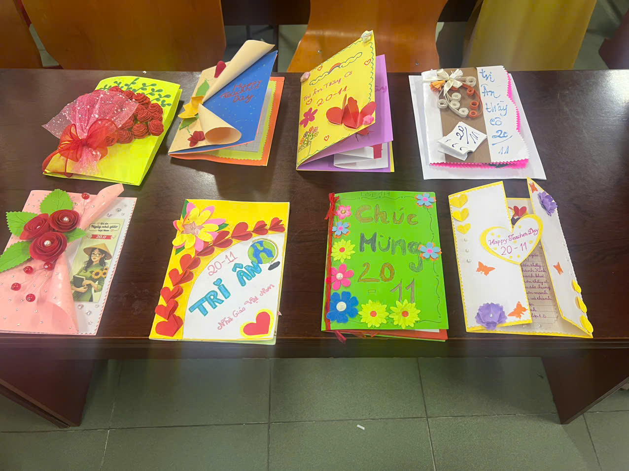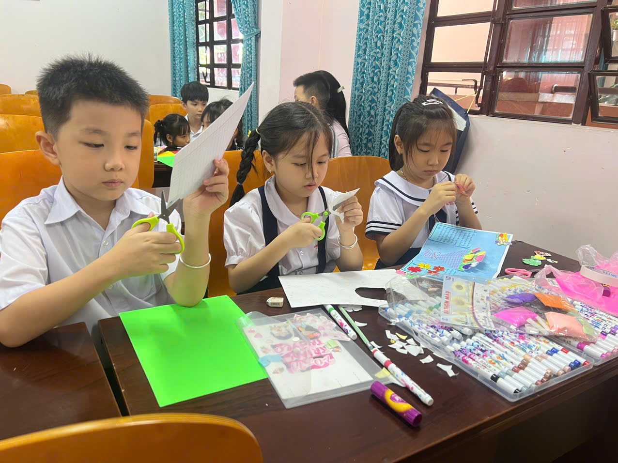 Các em học sinh chăm chú thiết kế thiệp tặng thầy cô