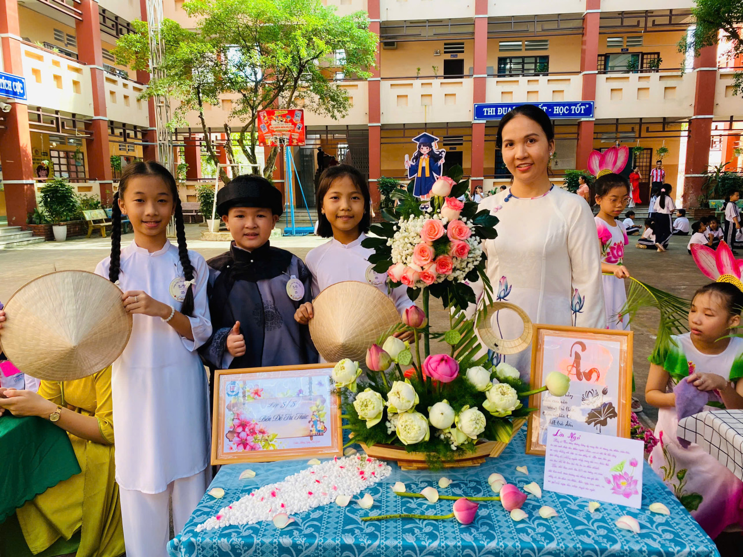 Các em học sinh khối 5 thi cắm hoa